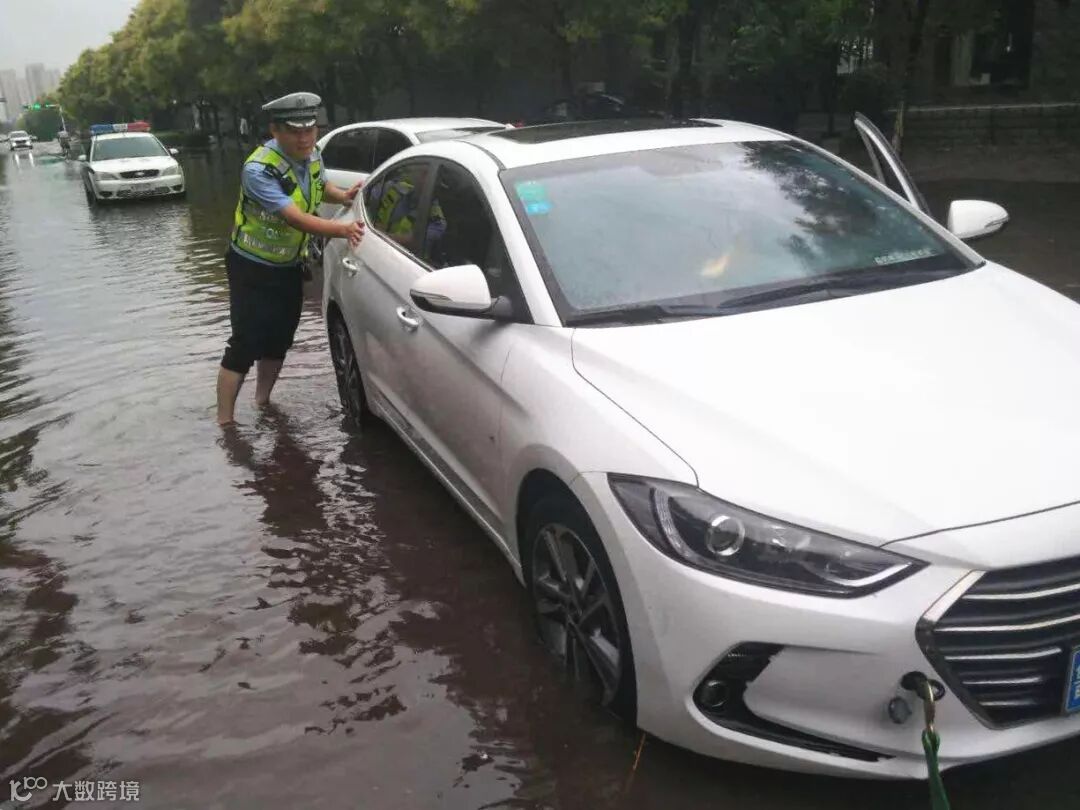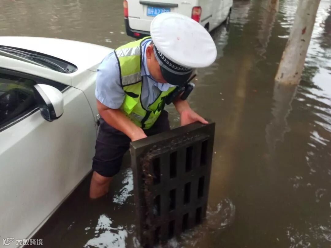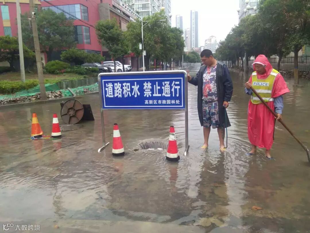 高新区交警大队全员出警上路,在严重积水区域设置警示标识、救助被困车辆、及时提醒车辆绕开积水严重区域行车。