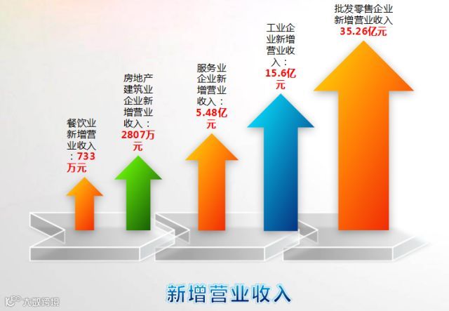 从新增营业收入看,工业企业新增营业收入15.6亿元、批发零售企业新增营业收入35.26亿元、餐饮业新增营业收入733万元、服务业企业新增营业收入5.48亿元、房地产建筑业企业新增营业收入2807万元。