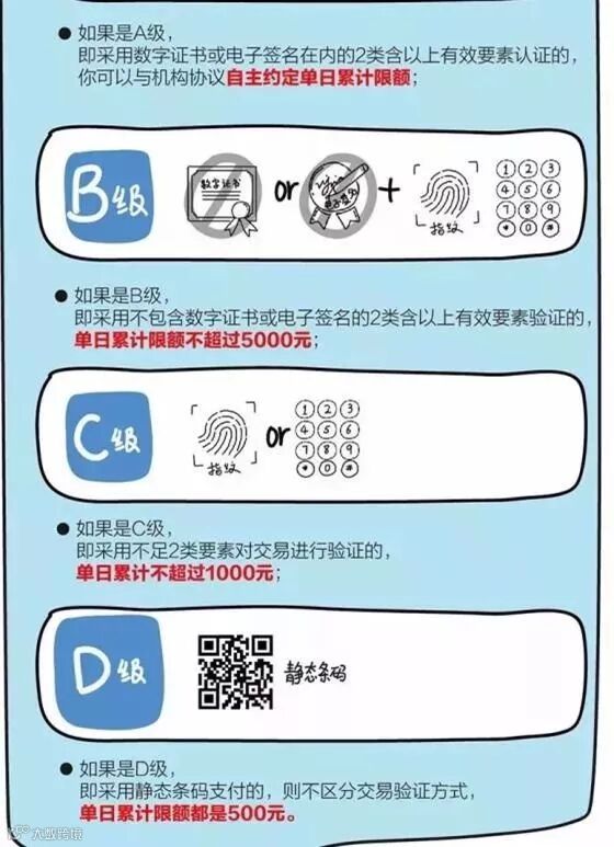 对于使用动态条码(如手机上实时生成的条码)进行支付的,风险防范能力根据交易验证方式不同分为A、B、C三级,同一客户单日累计交易限额分别为自主约定、5000元、1000元。