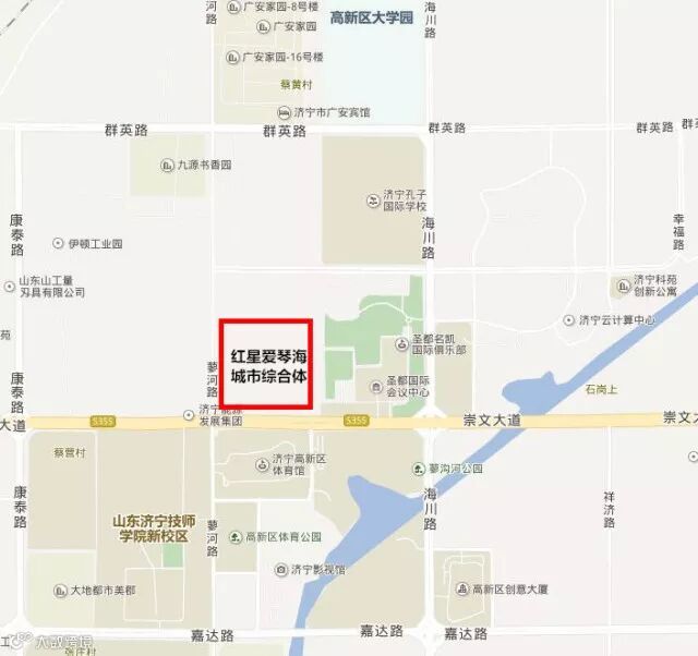 红星爱琴海城市综合体位于济宁高新区崇文大道以北,蓼河路以东。综合体向南不远,就是咱高新区体育馆、图书馆、科技馆、以及风景秀丽的蓼河湿地公园,购物的同时,还有美丽的景色相伴!从地理位置上,书香园、孔子国际学校、高新区大学园紧靠综合体,在高新区求学的学子以及在书香园居住的群众以后购物会非常方便!