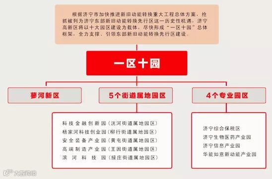 2017年,济宁高新区加快推进全市新旧动能转换引领区建设,全面推动“一区多园”管理体制改革,以十大园区建设为载体,全力支撑、引领新旧动能转换区建设,拉开“一区十园”建设序幕。