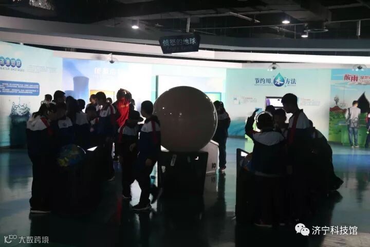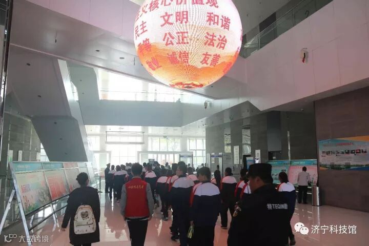 首先,映入各位学生眼帘的是科技馆的第一个展品 LED地球仪,由481片LED显示屏组成,通过短片播放的形式展示社会主义核心价值观具体内容。