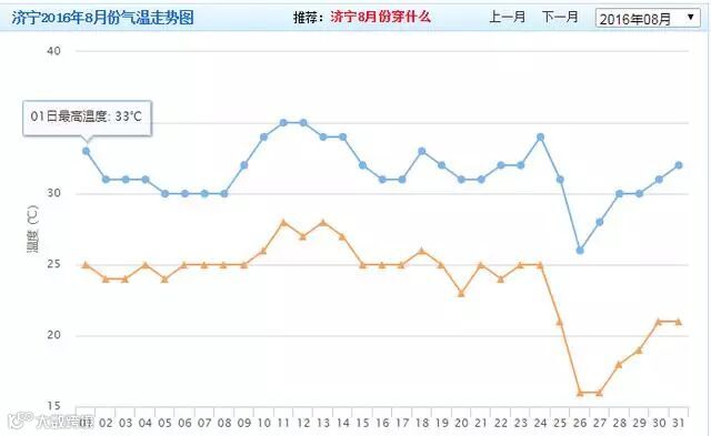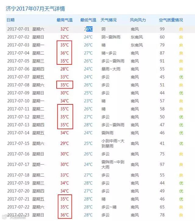 图中可以看出,去年7月大约有1周左右时间气温在30℃以下,大部分温度在30℃~32℃之间,只有4天气温高于35℃!