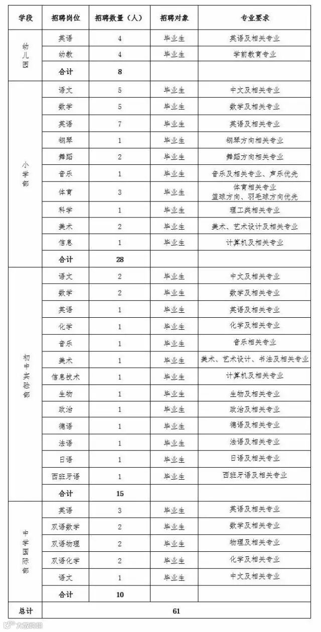 3、应聘幼儿园教师要求专科及以上学历,应聘幼儿园英语教师、小学部教师、初中实验部教师要求本科及以上学历,应聘中学国际部教师要求研究生及以上学历;