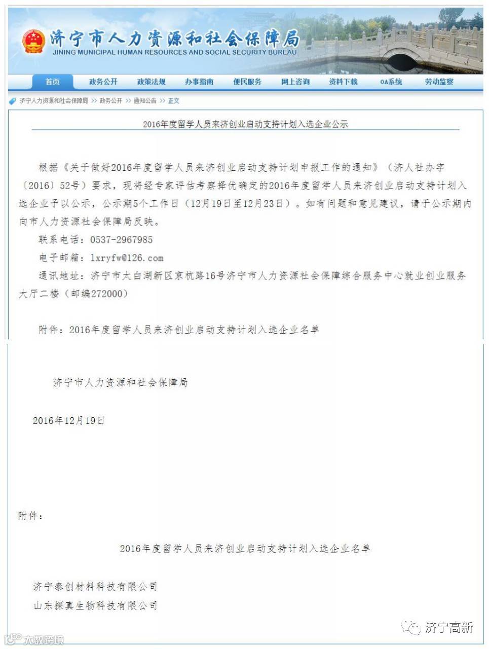 近日,济宁市人力资源社会保障局公示了“2016年度留学人员来济创业启动支持计划”入选企业名单,全市共有2家企业入选,其中创达园区内山东探真生物科技有限公司的阎可廷博士成功入选,获得资助经费10万元。