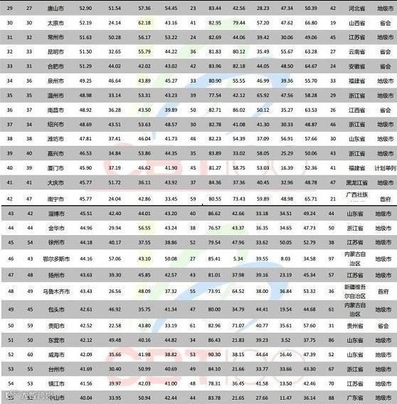 就上榜率分析,江苏13个城市全部上榜,最为均衡,山东、浙江分别只有2个和3个城市未上榜,发展也很均衡。广东内部发展严重失衡,广州、深圳分列第3、4位,但仍有12个地级市未上榜。