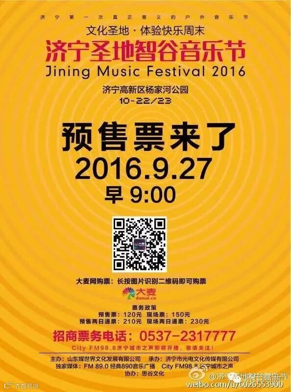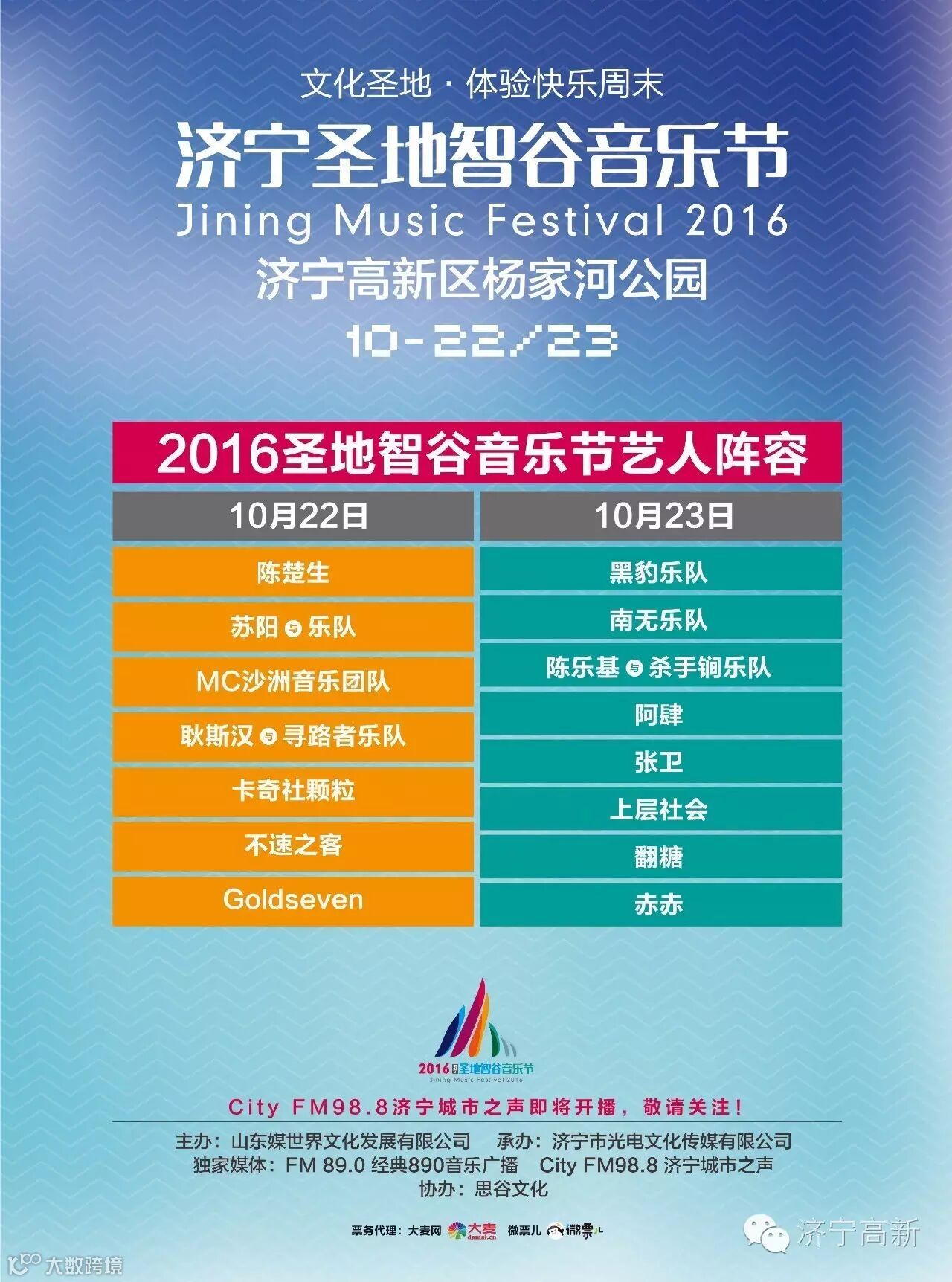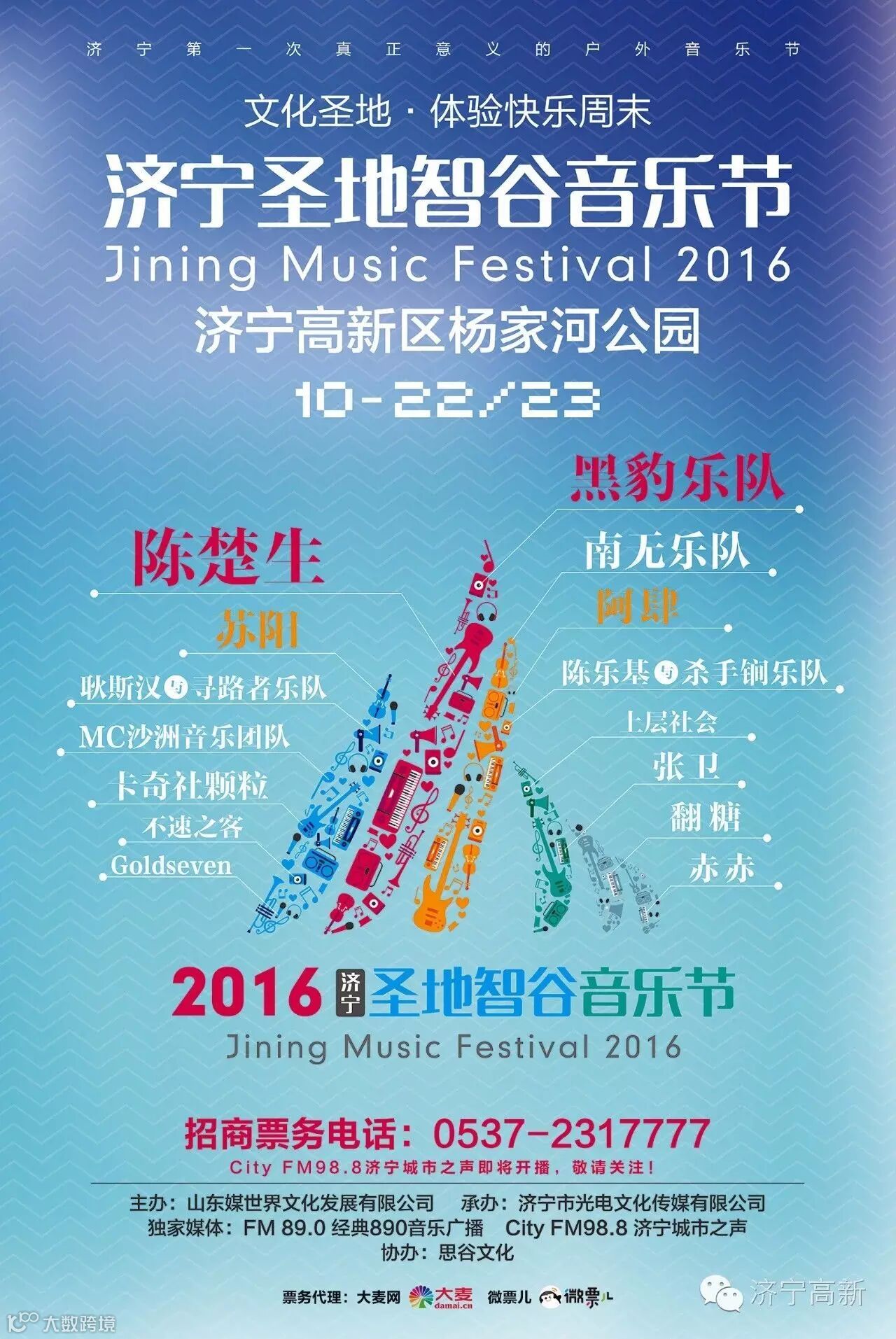 10月22日--23日,2016济宁圣地智谷音乐节将登陆济宁杨家河公园,此次音乐节由高新区管委会、山东媒世界文化发展有限公司主办,济宁光电传媒有限公司承办,City FM98.8济宁城市之声、FM89.0经典890音乐广播协办,这将是济宁第一次真正意义上的音乐节。