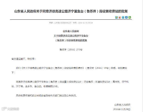 说完高铁再来说说高速! 12月1日,山东省政府网站公布对在济徐高速公路济宁至鱼台(鲁苏界)段设置收费站的批复,同意在济徐高速公路济宁至鱼台(鲁苏界)段设置主线收费站1处:济徐鲁苏;匝道收费站5处:嘉祥东、济宁机场、济宁南、金乡东、鱼台西。收费期限25年。具体收费标准和起止时间由省政府有关部门核定后公布执行。