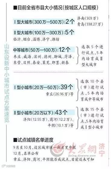 试点方案还提到,从城区人口20万-50万的39个Ⅰ型小城市中,选取10个县(市)进行试点,到2020年培育成为50万人口以上的中等城市。同时,从城区人口20万以下的43个Ⅱ型小城市中,选取15个县(市)进行试点,到2020年培育成为20万人以上的Ⅰ型小城市。属于Ⅰ型小城市的邹城、曲阜以及属于Ⅱ型小城市的金乡、泗水、梁山、嘉祥、微山、汶上、鱼台是否能够成为试点,将在今年12月份进行揭晓。