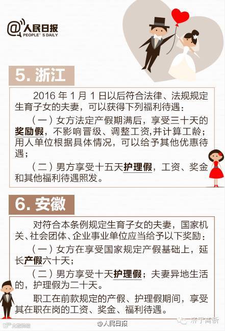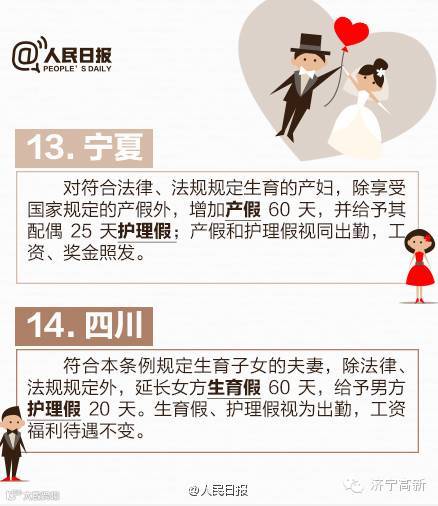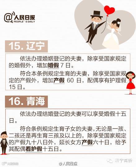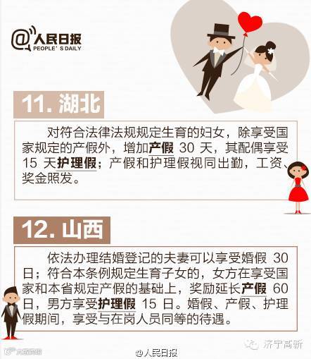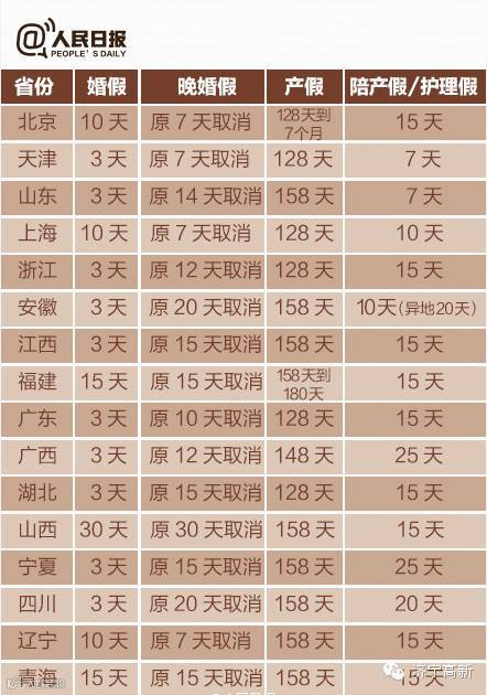 据统计,目前已有包括北京、上海、广东等在内的至少16个省/自治区/直辖市修改了本地区的计生条例,各地婚假、产假及陪产假多有变动。其中,山西婚假最长,达30天;北京产假最长可达7个月;陪产假最长的是广西和宁夏,25天...你那儿能休多久?