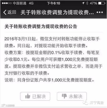 具体收费方案为,每位用户(同身份证账号共享额度)终身享受1000元免费提现额度,超出部分按银行费率收取手续费,目前费率均为0.1%,每笔最少收0.1元。微信红包、面对面收付款、AA收款等功能不受影响,免收手续费。