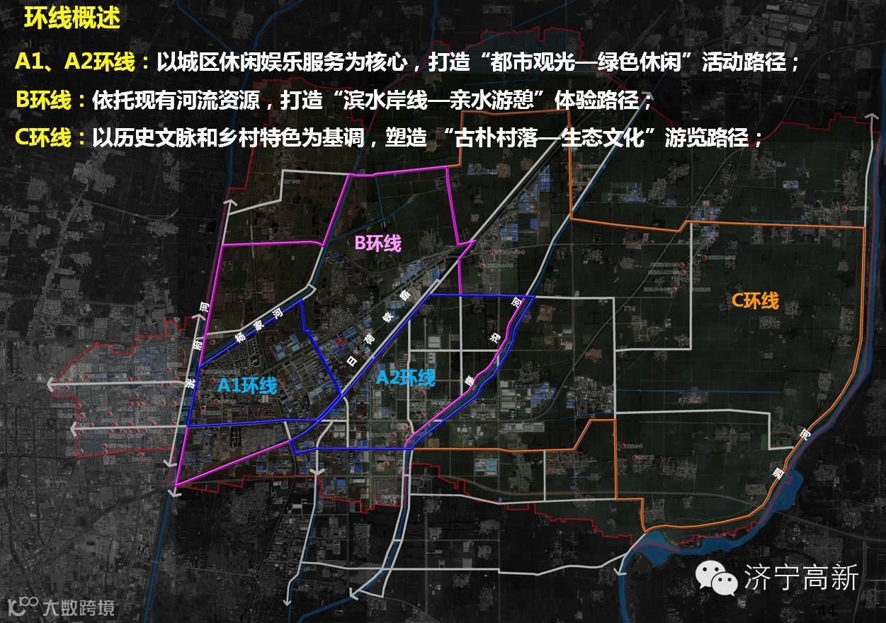 根据规划,绿道重点确定的选线思路是:主线临水、辅线串绿、连线穿城、游憩成环,将充分利用济宁高新区丰富的绿地景观资源、湿地公园及水域游憩风光,依托现有滨河道路、村道基础、城乡公交系统,将河流、公园、广场、东城中心、遗址等景观吸引点及田野风光有效串联;联系城市公共服务中心,协调现状规划差异,划分近远路线;贯通自行车游径,适时分线设置步行路径。绿道构建的远期目标将以点带面,在构筑生态廊道的同时,注重节点空间分布,联通九个城市公共服务中心,形成多因子叠加的绿道网结构形态。