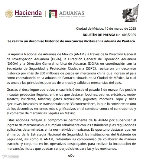 墨西哥国家海关总署(ANAM)在墨西哥城潘塔科海关进行了一次历史性的缉私行动,共查获了价值超过3亿比索(约合人民币1.1亿元)的中国商品。此次行动于3月5日开始部署,共涉及33个集装箱的非法产品,包括扬声器、电动溜冰鞋、摩托车、踏板车、自行车、钻头、液压千斤顶、玩具、背包、衣服和行政椅等多种商品。
