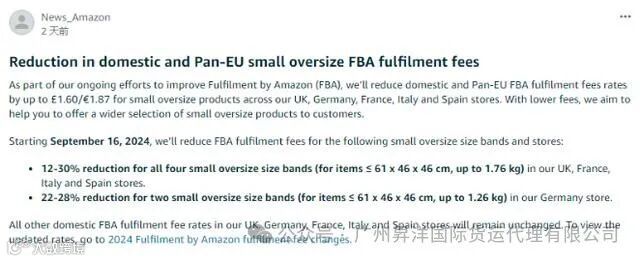 近日,亚马逊欧洲站发布了一则重要公告,宣布自9月16日起,将显著下调英国、德国、法国、意大利和西班牙站点的小型超大件FBA配送费用。