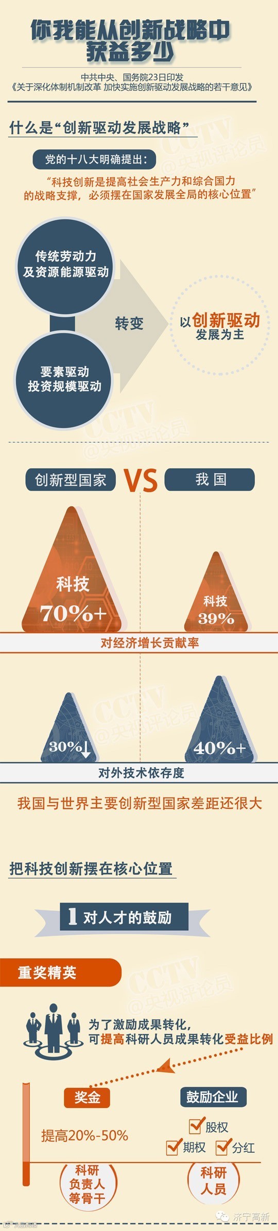 中共中央、国务院23日印发《关于深化体制机制改革加快实施创新驱动发展战略的若干意见》。这是一份与你我息息相关的国家战略计划,无论你是大学生,上班族,还是创业者,亦或是企业人,都可以从中找到对自己未来发展有用的信息,让我们一起来了解一下~~~