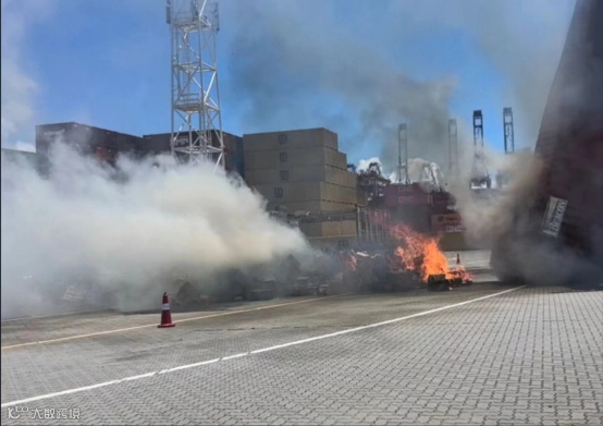 随后,盐田区消防和海事对该柜进行了应急处置,货物从柜里倒出后出现明火燃烧,目前货物已无明火及冒烟,目测状况稳定。