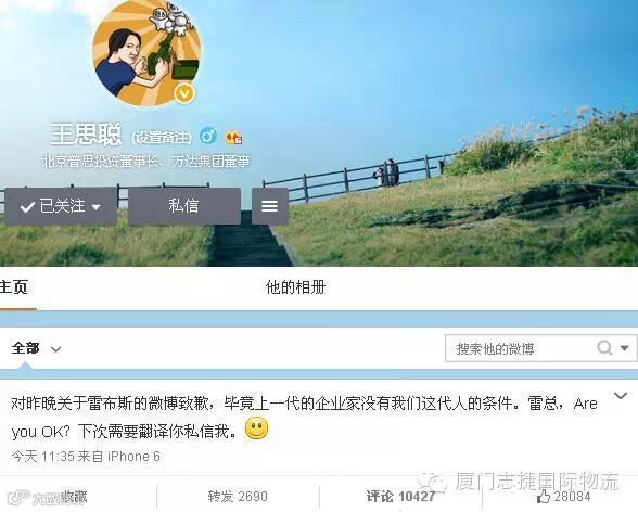 “国民老公”王思聪在微博转发了雷军的微博,并吐槽称,其实英语不好的企业家我真建议你们就干脆别出国丢这个脸了。