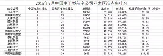 山东航空以59.70%的准点率排名中国第一,接近亚太区61.62%的平均值。