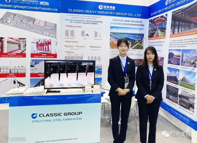 展会上,经典集团展示了代表未来绿色建筑发展趋势的先进技术成果、典型代表工程、行业发展成就,演示了经典钢结构建筑的研发设计、生产制造、建筑施工的过程,彰显了强劲的综合实力和优秀的品牌影响力,赢得了众多海外客商高度评价和一致赞赏。
