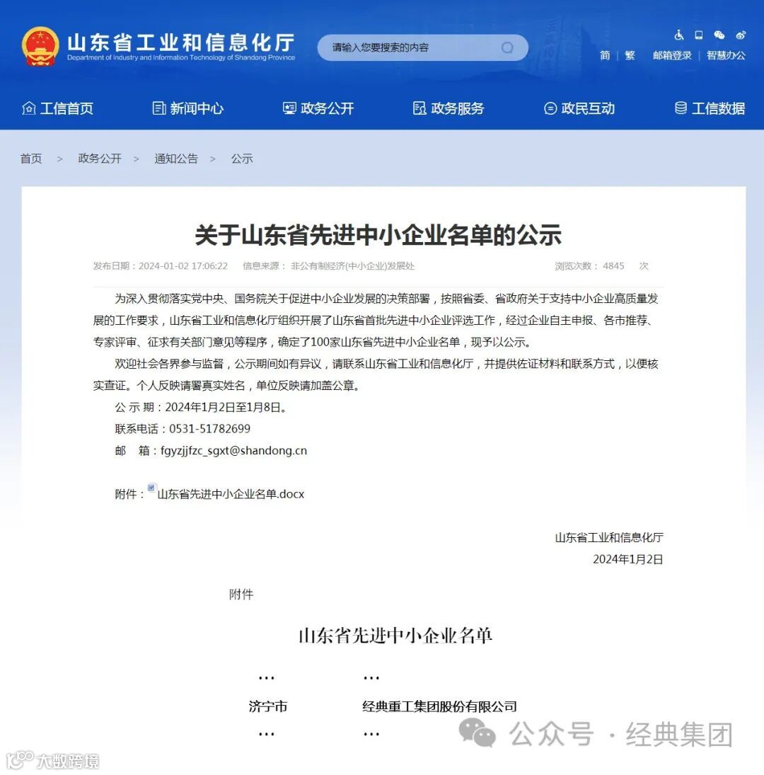 近日,山东省工业和信息化厅组织开展了山东省先进中小企业评选工作,最终确定了100家山东省先进中小企业名单,经典集团成功入选。值得一提的是,这是山东省首次评选先进中小企业,并每三年评选一次。
