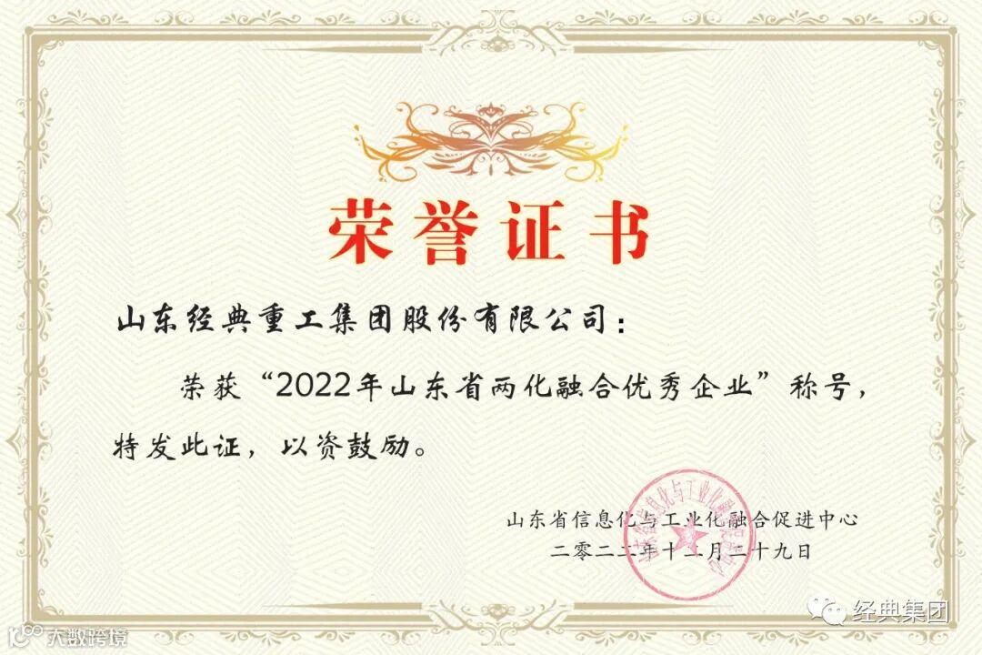 导读:近日,山东经典重工集团股份有限公司被山东省信息化与工业化融合促进中心授予“2022年山东省两化融合优秀企业”称号。