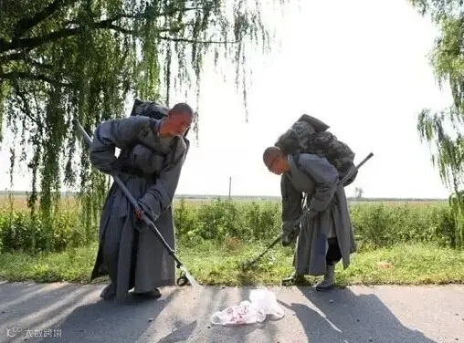 路上遇到被过往车辆碾死的众生,僧人用随身携带的方便铲将众生铲起,就近掩埋,以息其怨气,长养慈悲。