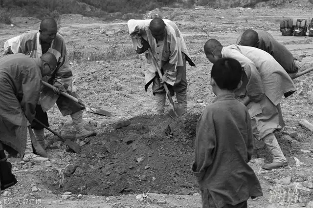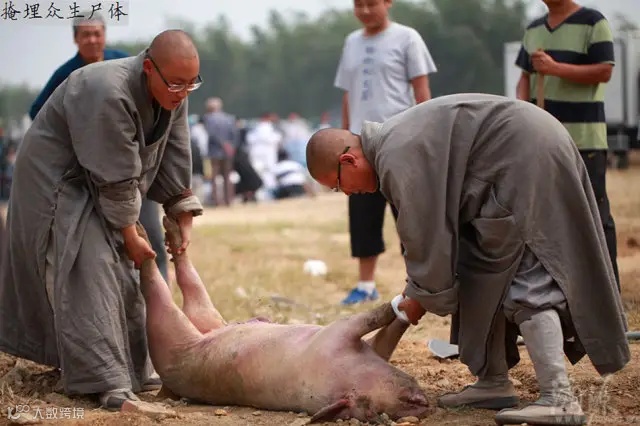路遇被弃的亡故小猪尸体,僧人们合力挖坑掩埋。