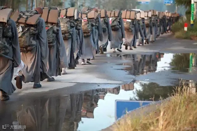 寺院无功德箱,不搞经营买卖。全体僧人日中一食,过午不食,每天睡4个小时,日打坐时间为“五支香”(禅宗术语:燃烧五支香的长度)。图为雨中行走。