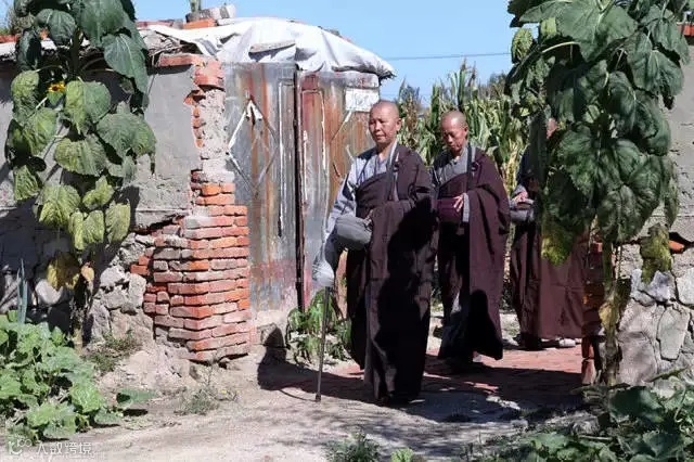 60岁的道源寺住持释妙融法师带队前往村中乞食。