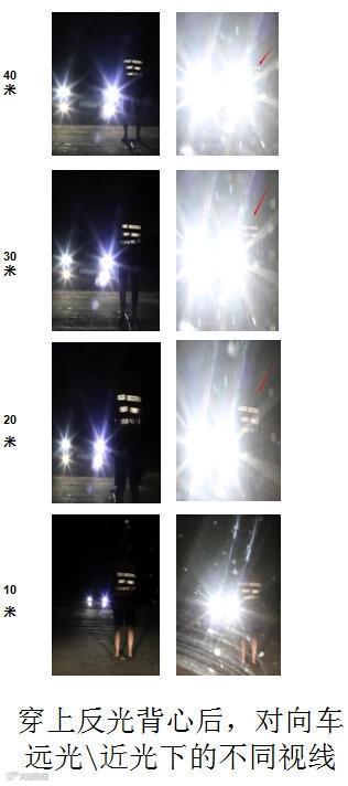 第二种情况:文明点的做法,对向车主动切换到近光灯,穿上反光背心可以在40米元的地方被察觉到。
