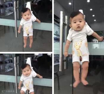 爸比将乱爬的宝宝挂在门上,这倒是预防危险的好办法!