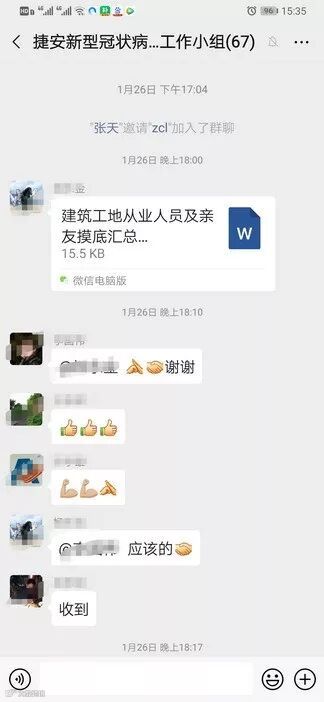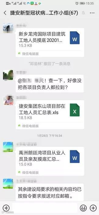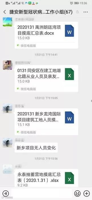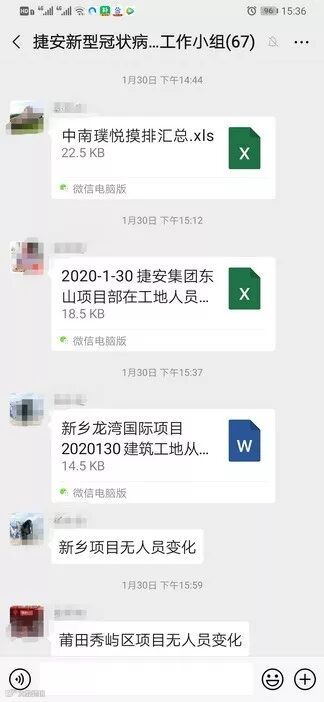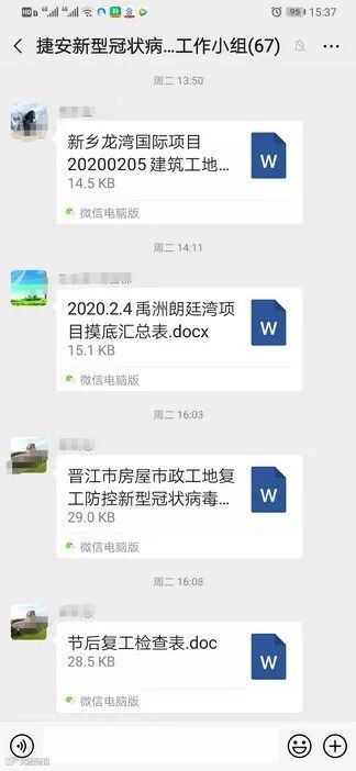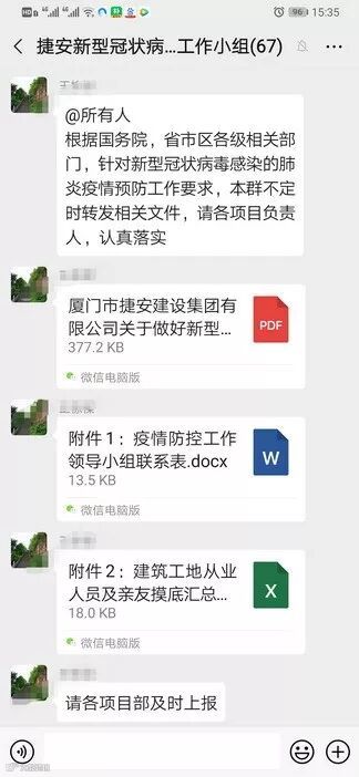 疫情防控工作领导小组、集团总部相关部门管理人员、各在建项目部项目经理及负责人、现场管理人员组建防控工作群,迅即传达上级疫情防控最新指示,对公司战“疫”工作深入动员部署,对各项目部工地人员及亲友展开拉网式摸底排查。10余天来,通过防控工作群,实时传达疫情最新消息、防控最新措施,各项目部汇报每日人员排查及防控措施落实情况,坚决打好疫情防控阻击战。