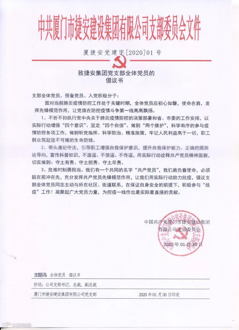 1月30日,捷安集团党支部发出《倡议书》,倡议全体党员务必做到听党指挥、科学防治、精准施策;务必带头遵纪守法,提升自我保护能力,不造谣、不信谣、不传谣;倡议党员同志主动与所在社区、街道联系,在保证自身安全的前提下,积极参与“战疫”工作。