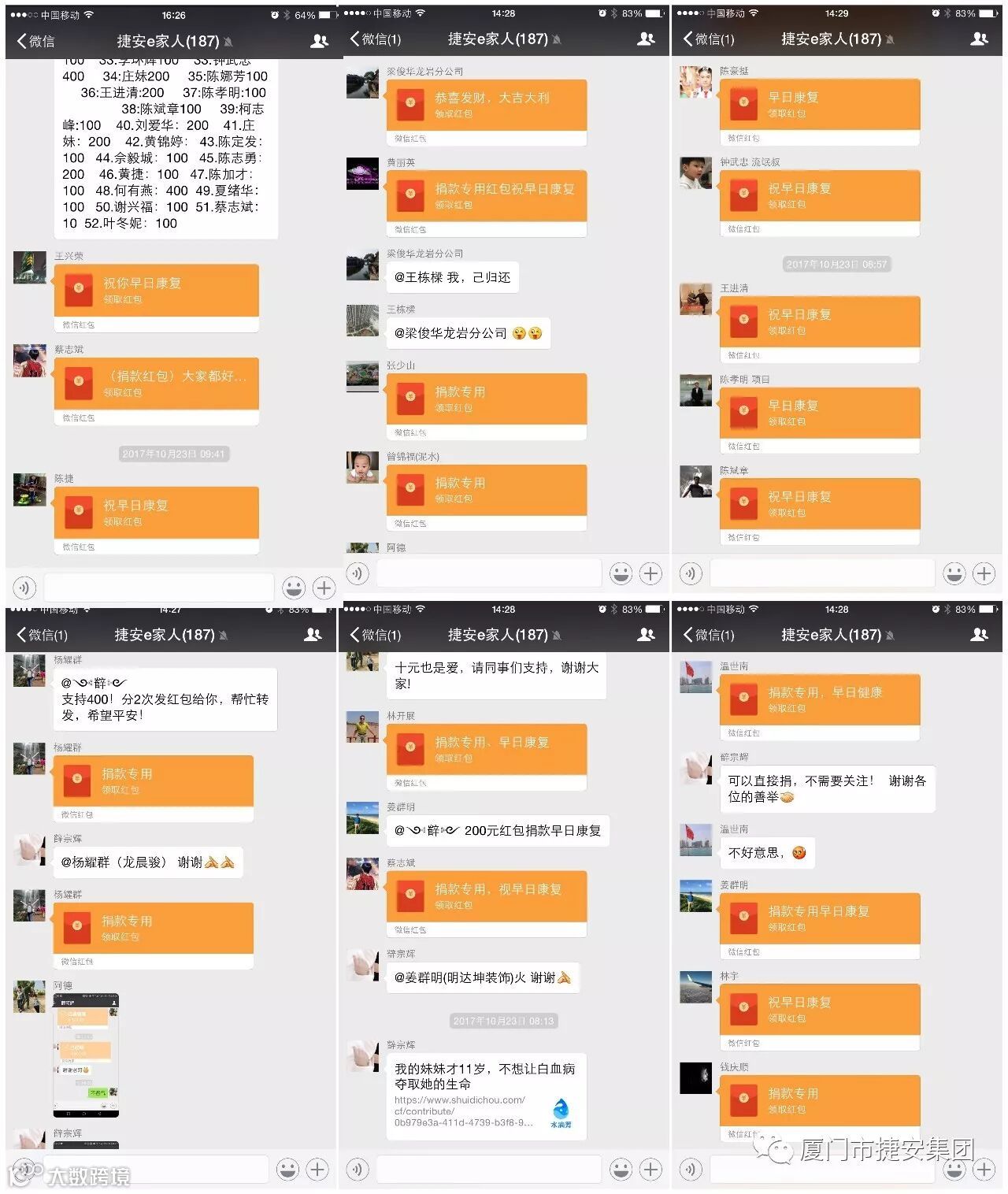 一石激起千层浪,“捷安e家人”群中立刻下起了红包雨,都是“捐款专用”“祝早日康复”的红包。
