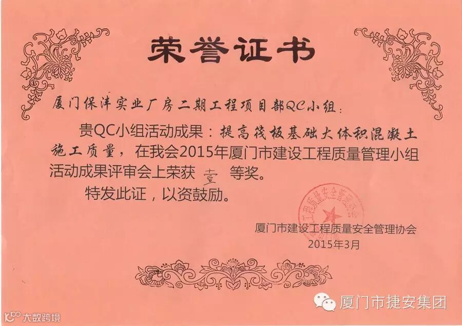 捷安厦门市建设工程质量安全管理协会于2015年3月16日组织了2015年厦门市建设工程质量管理小组活动成果(简称QC成果)评审会,经过评委小组审定,对81个QC成果、2个个人、1个小组进行表彰。其中,我公司厦门保沣实业厂房二期工程项目部QC小组《提高筏板基础大体积混凝土施工质量》荣获壹等奖、过芸溪二组团项目部QC小组《提高坡屋面混凝土外观质量》荣获贰等奖。