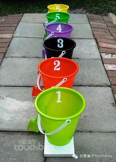 小水桶,小铁罐或者直接在地上画出投掷的区域,标出得分,和孩子一起玩个扔沙包的投掷比赛吧。