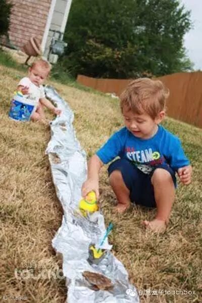 你能看出这条小溪是用锡纸做成的吗? 把小朋友嬉水的小鸭子,小船都拿来吧,简单又好玩的情景游戏哦!