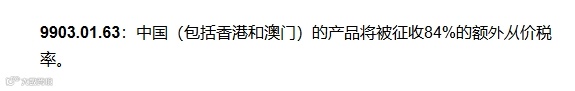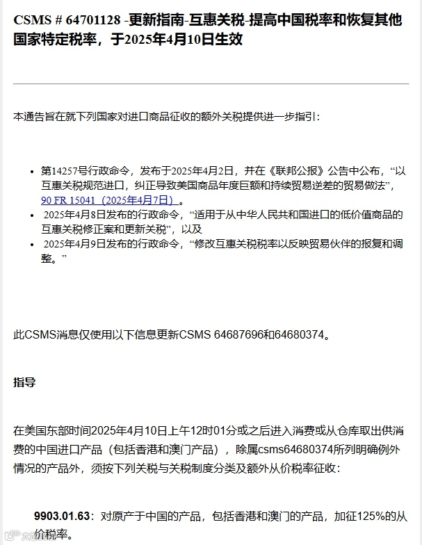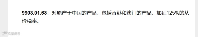 4月10号最新税号9903.01.63更改信息,由昨天的对原中国的产品加征84%的从价关税修改为125%。