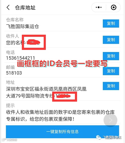 各位宝宝们,需要注意这个point哦:寄到仓库的地址填写一定要按照小程序内获取仓库地址的信息填写,尤其是ID号一定要填写的