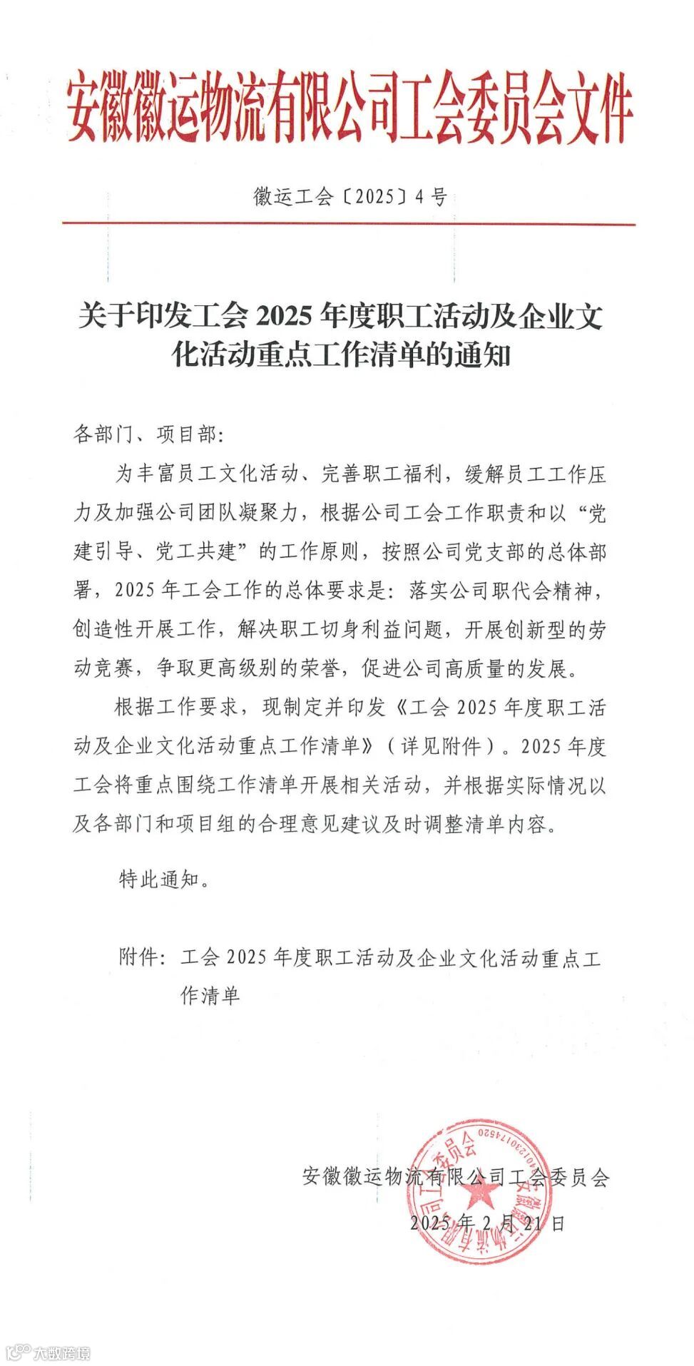 根据工作要求,现制定并印发《工会2025年度职工活动及企业文化活动重点工作清单》。2025年度工会将重点围绕工作清单开展相关活动,并根据实际情况以及各部门和项目组的合理意见建议及时调整清单内容。