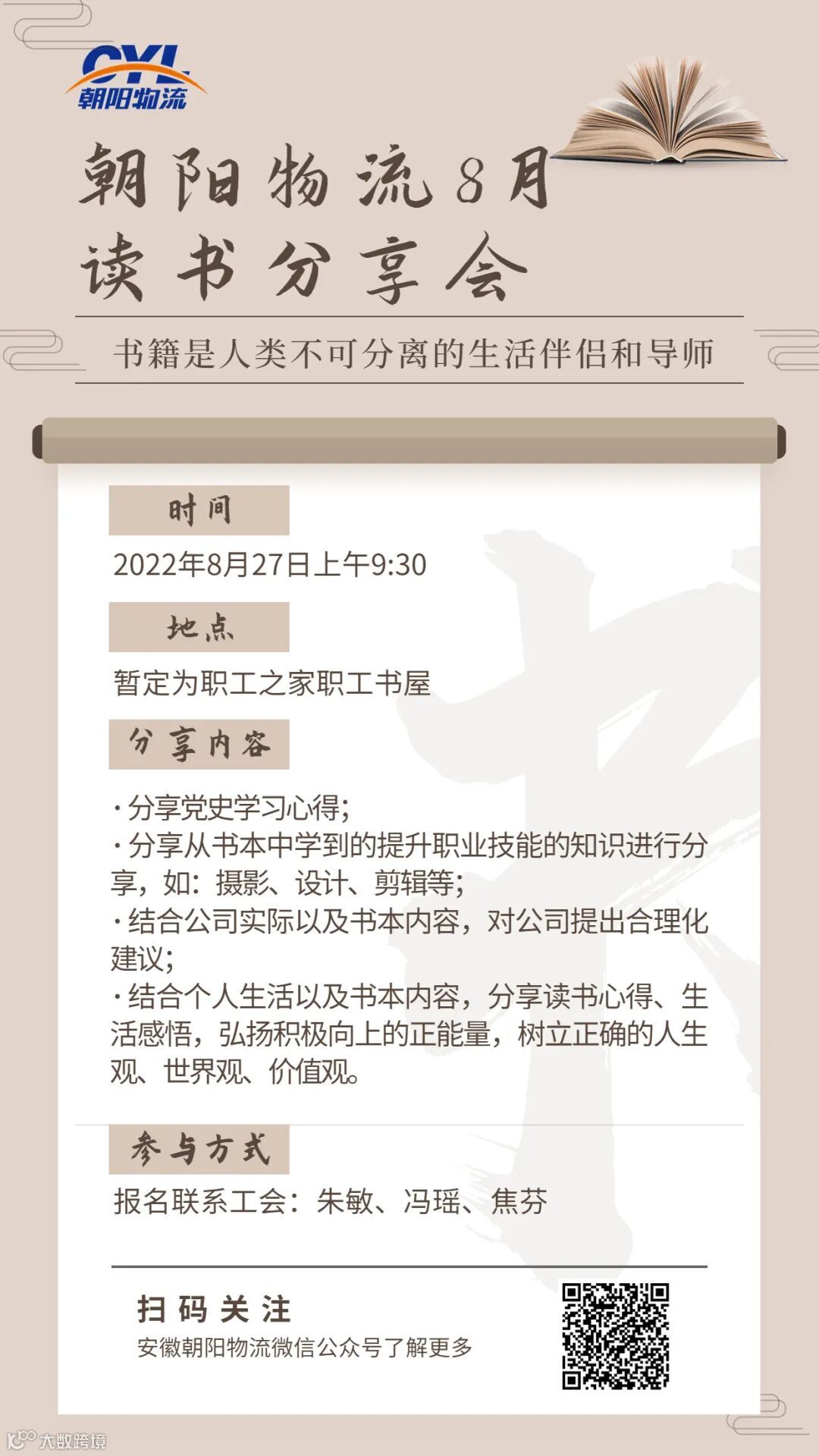 “最是书香能致远”,为了让大家在阅读中得到交流,营造浓厚的学习氛围,公司工会特组织八月读书会活动,大家赶紧来报名吧!