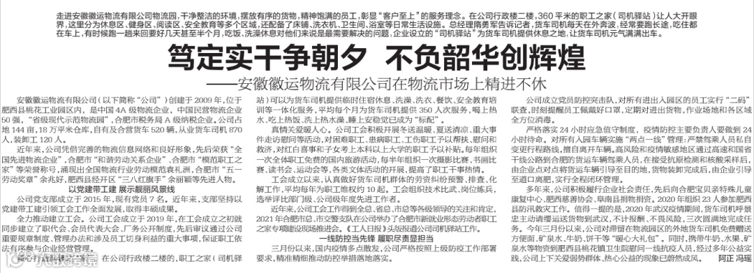 近年来,公司工会工作得到全总、省总、市总等各级领导的关注和肯定,2021年合肥市总、市交警支队在公司举办了合肥市新就业形态劳动者职工之家专项建设现场推进会。《工人日报》头版报道公司司机驿站工作。