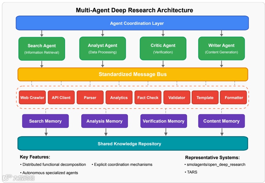 多智能体架构 (Multi-Agent Architecture):由多个专门的自主智能体(如搜索、分析、批判智能体)协作完成任务。优点是能处理需要多种专业能力的复杂任务,但保持整体一致性具有挑战性。代表系统是smolagents/open_deep_research。