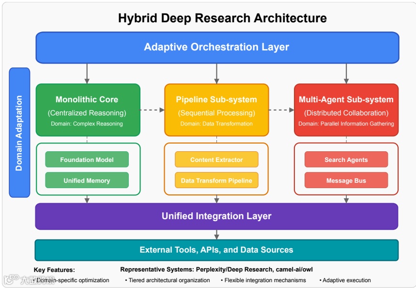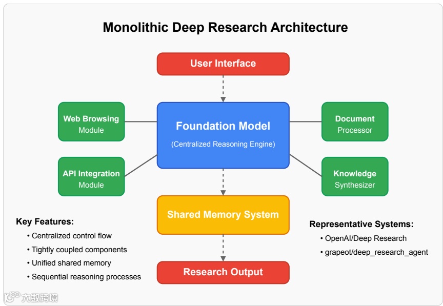 单体架构 (Monolithic Architecture):所有功能围绕一个核心推理引擎紧密集成。优点是连贯性强,但扩展性差。代表系统是OpenAI/DeepResearch。