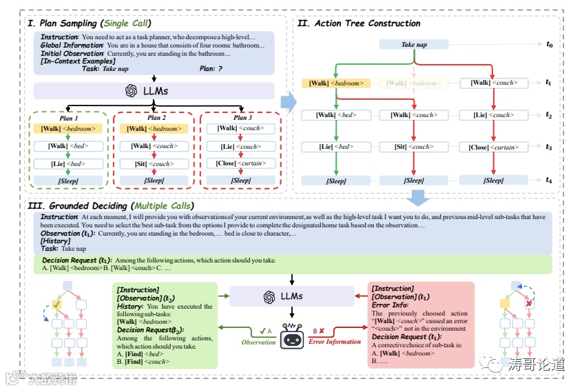4. 在基于环境的决策阶段,语言模型在动作树上进行选择,充分利用环境反馈。还设计了基于树的错误纠正机制,更加高效。