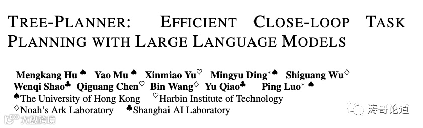 语言模型输出的树状建模。Yao等(2023); Long(2023)都提出了链式思维的替代方法,称为“思维树”,用于解决问题。这些研究不涉及树中内部步骤与环境的交互,而更侧重于推理任务。考虑机器人领域,Cao和Lee(2023)利用LLM进行自动生成基于行为树的任务。Zhao等(2023); Hao等(2023)提出使用LLM作为世界模型来辅助规划算法,如蒙特卡罗树搜索(MCTS)。但是,树规划器一次采样各种路径,并将这些路径聚合成一个动作树,而不需要像上述研究那样多次调用LLM。这种方法在运行时效率和令牌效率方面都具有优势。