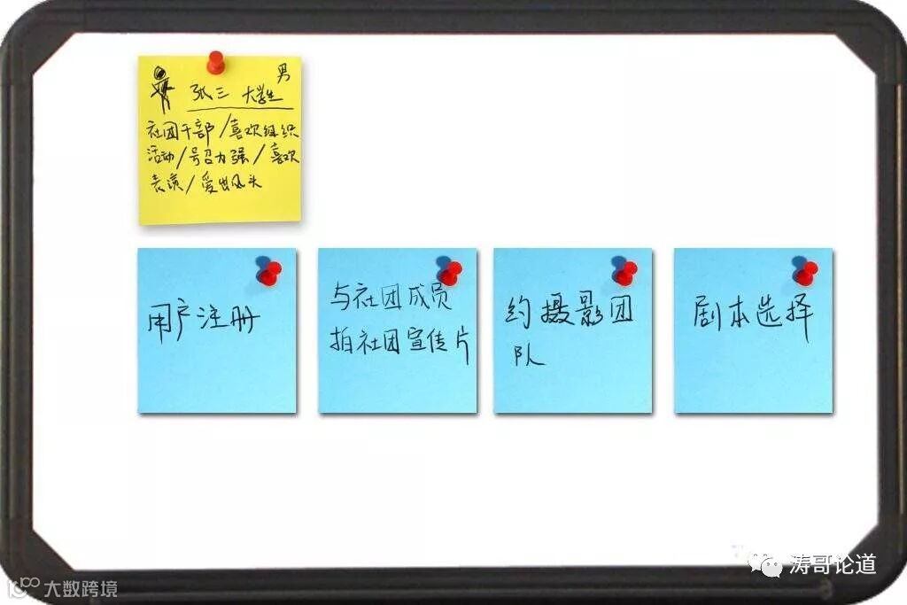 第一是卡片,也就是用一张卡片来记录故事描述,工作量估计等。
