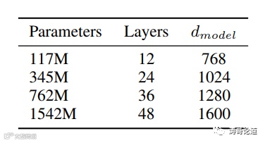 GPT-2训练了4个模型,最小的模型规模和GPT是一样的,第二小的和最大的BERT规模一样,最大的模型叫做GPT-2,其具有比GPT多一个数量级的参数。每个模型的学习率在5%的WebText保留样本上手工调整以获得最佳的值。所有的模型目前在WebText上都还存在欠拟合的情况,如果给更多的时间去训练的话效果还能进一步的提升。