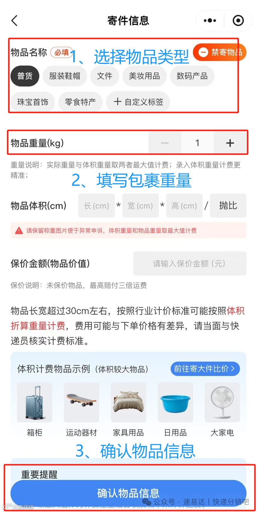 点击「物品信息」,根据实际情况选择「物品类型」填写「包裹重量」等,最后确认物品信息。
