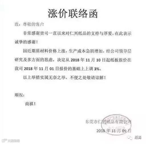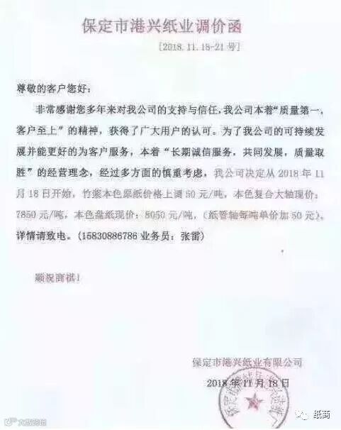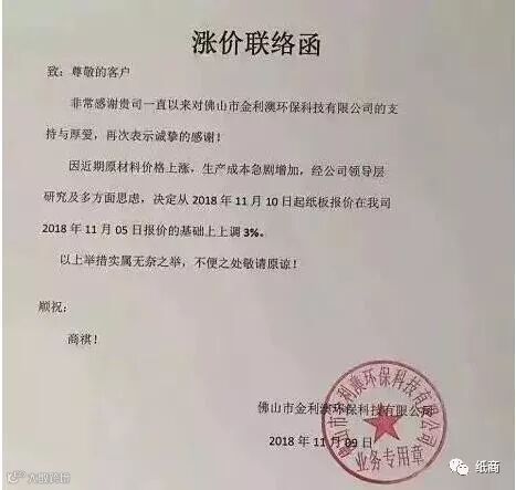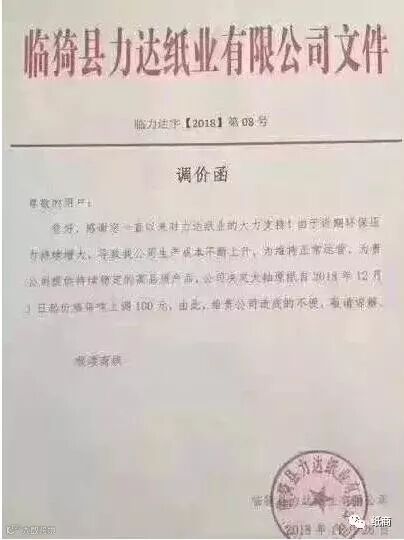 11月26日,临猗县力达纸业有限公司再发涨价函: